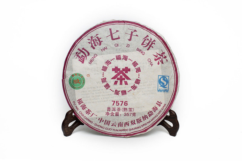 Блин фабрики «Фу Хай», с номером рецептуры 7576. Рецепт был создан в 75 году, в составе используется сырье 7-го номера из имеющихся 10 (чем выше номер тем лучше), номер 6 указывает на то, что он сделан на фабрике «Шесть великих чайных гор», и выпущен под маркой «福海» Fúhǎi, что переводится, как «Море счастья». У нас хранится два вида блинов этого рецепта 2012 года и 2007 года. Блин 2012 года, не такой старый, но уже «сухой» и крепкий - это результат купажирования крупных мощных листьев и почечного сырья. Интересный по вкусу чай с местами грубым сырьем.