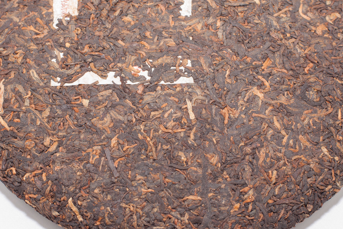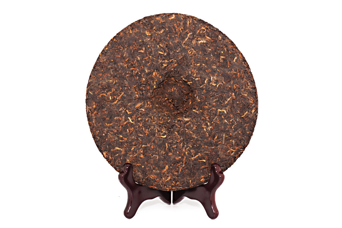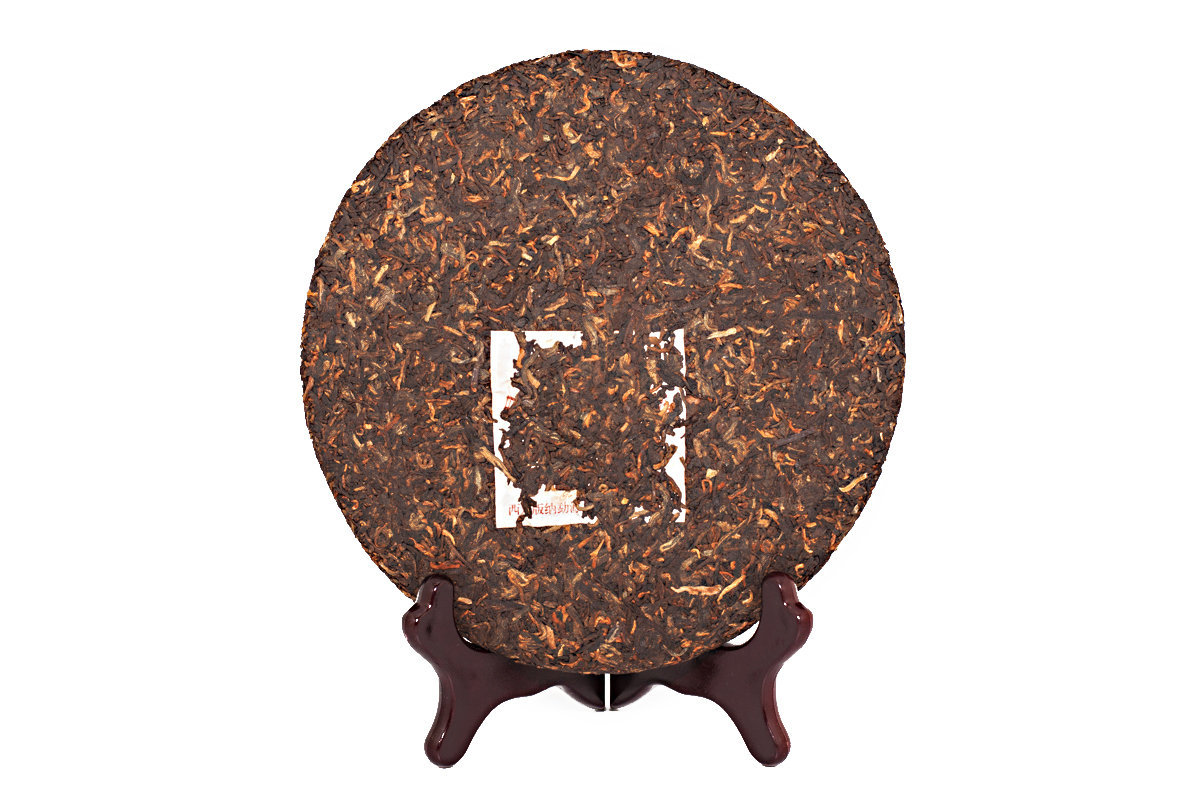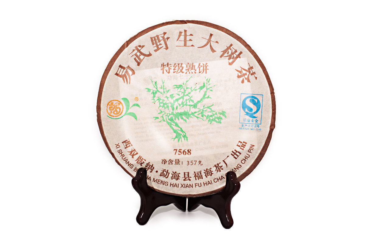 Блин, приготовленный по рецепту 7568 заводом Фухай, что в переводе означает «Море счастья». Аромат сухого листа напоминает овсяные пряники, при заваривании дополнительно чувствуются травяные отзвуки – необычный букет. Вкус чая мягкий, фруктовый, ассоциируется с печёными персиками. Чай 4-х лет выдержки, а старое дерево на обложке – намёк на древние традиционные рецепты приготовления чая.