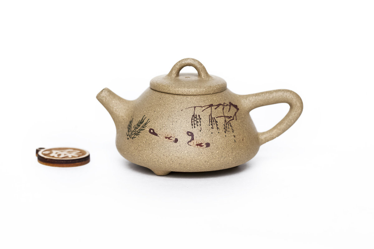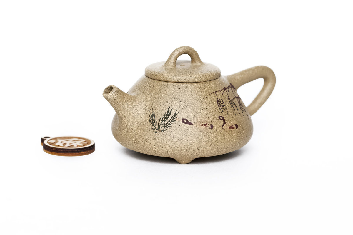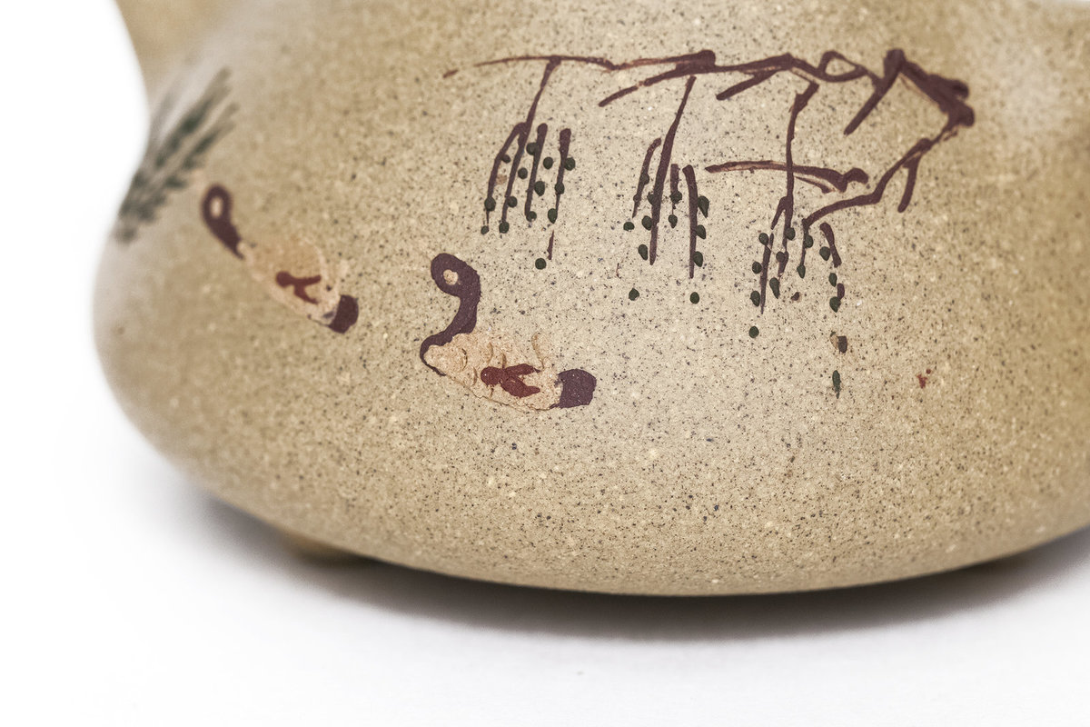 Особенность чайника в росписи глиной на его теле. Маленький объём чайника подходит для заваривания шу пуэров или для заваривания по чаочжоускому методу.